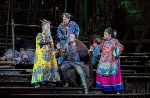 Kowaljow was a full-voiced, Timur, the exiled King of Tartary, especially touching after Liù’s death. In one of the opera’s more nostalgic scenes, baritone Hansung Yoo (company debut), tenors Tony Stevenson and Rodell Rosel deftly portrayed Turandot’s capricious ministers, Ping, Pang and Pong, as they dreamily reminisced about their country cottages in their quiet and dreamy trio, “Ho una casa nell’Honan”.
