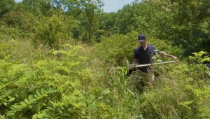 Smith uses a traditional sythe to hack the undergrowth back as needed.